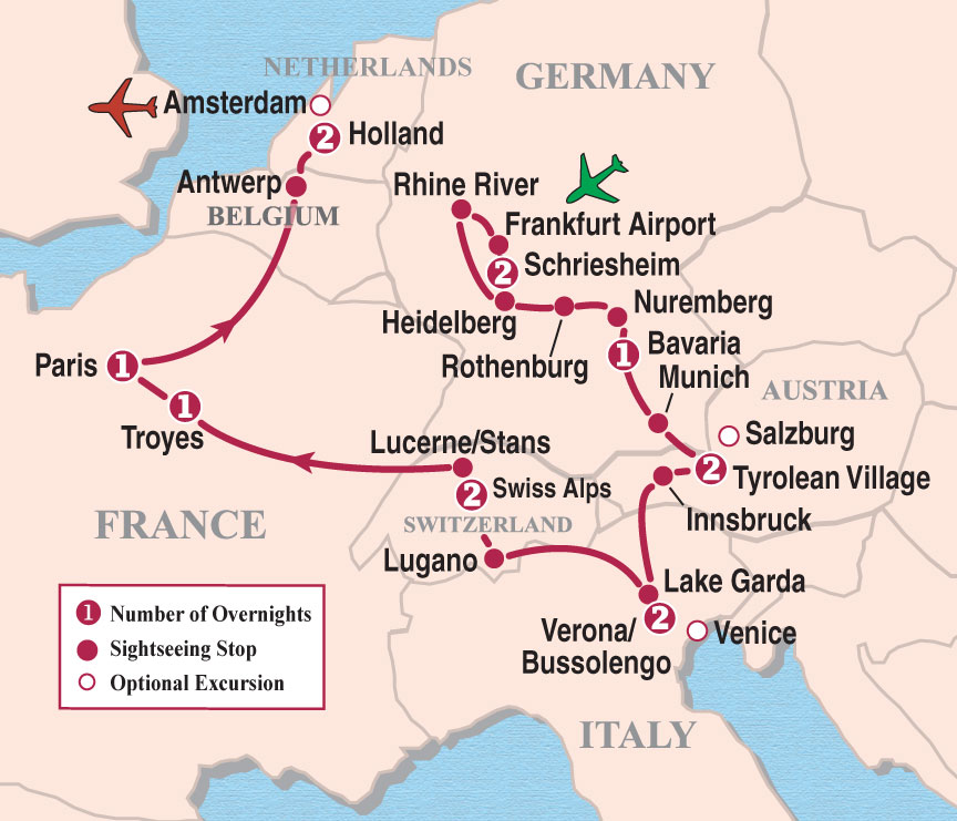 Since 1960, Image Tours has offered its signature tour of Europe's most popular countries. With spectacular scenery and local flavor, this is an ideal choice for travelers who want an introduction to the Old World at a great value. The tour includes a Rhine River boat ride past castles and vineyards and a walk along Rothenburg’s medieval wall. Sip ale at Munich’s Hofbräuhaus beer hall. Enjoy views of the Alps from an Austrian chalet, marvel at Paris's architectural triumphs, and try on traditional Dutch wooden shoes. Join us for an unforgettable journey through Europe's most popular destinations, crafted for a truly enriching travel experience. The tour's highest elevation is 3,855 feet in the St. Gotthard Tunnel, with some routes reaching 6,919 feet and Swiss hotels at 2,900 feet. Walking Expectations: “Active” - An average of 3 1/2 miles per day often encountering uneven surfaces, steps and inclines.